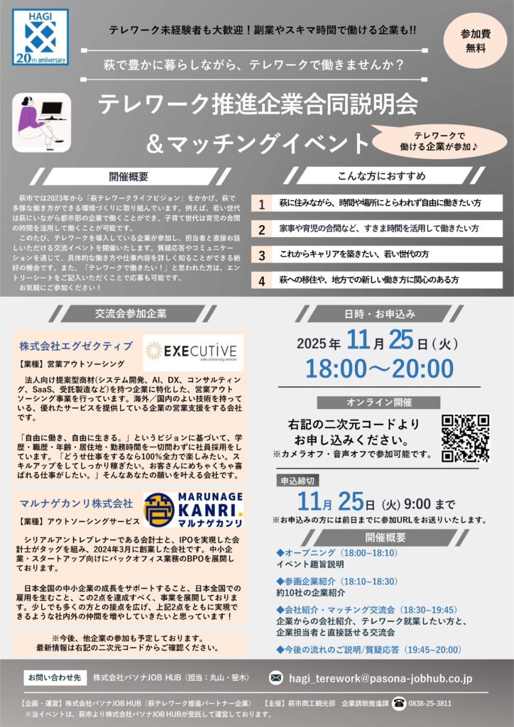 萩市では、テレワークで採用したい企業と、萩市在住者や萩市に移住就業を希望される方とのマッチングを支援しています。