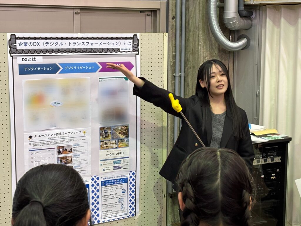 高校生の皆さんに対し、萩市のIT企業のPRだけでなく、DXに関する会社概要等をご説明しました。現代社会で身近なものである「AI」についても、興味深く聞いていただき、関心の高さが伺えました。