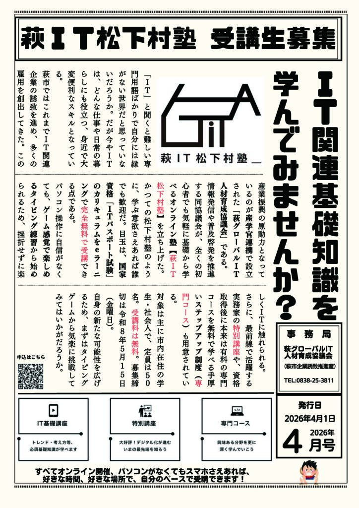 萩グローバルIT人材育成協議会では、国家資格「ITパスポート試験」のカリキュラムを無料で学べるe-Leaningコンテンツの提供、特別講座(セミナー等)、資格取得支援補助を実施します。